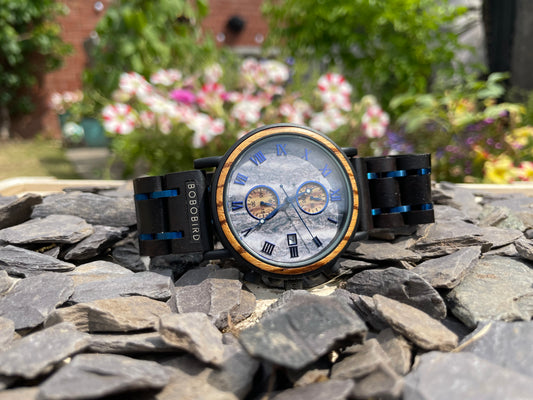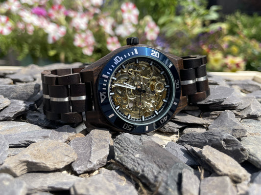Black Wood & Blue Metal Interlocking Strap Self Winding Wooden Eco Watch
