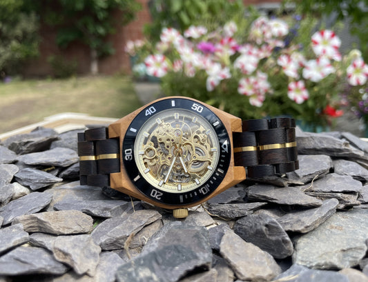 Black Wood & Gold Cog Style Interlocking Strap Self Winding Wooden Eco Watch