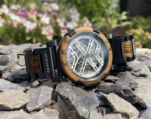 Stencil Style Face With Black Wood & Metal Interlocking Strap Self Winding Wooden Eco Watch