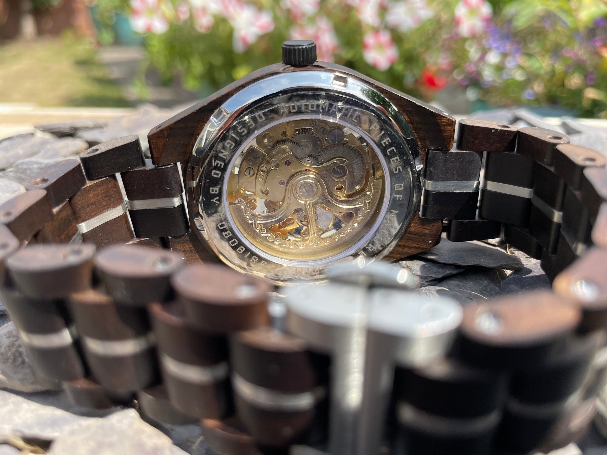 Black Wood & Blue Cog Style Interlocking Strap Self Winding Wooden Eco Watch