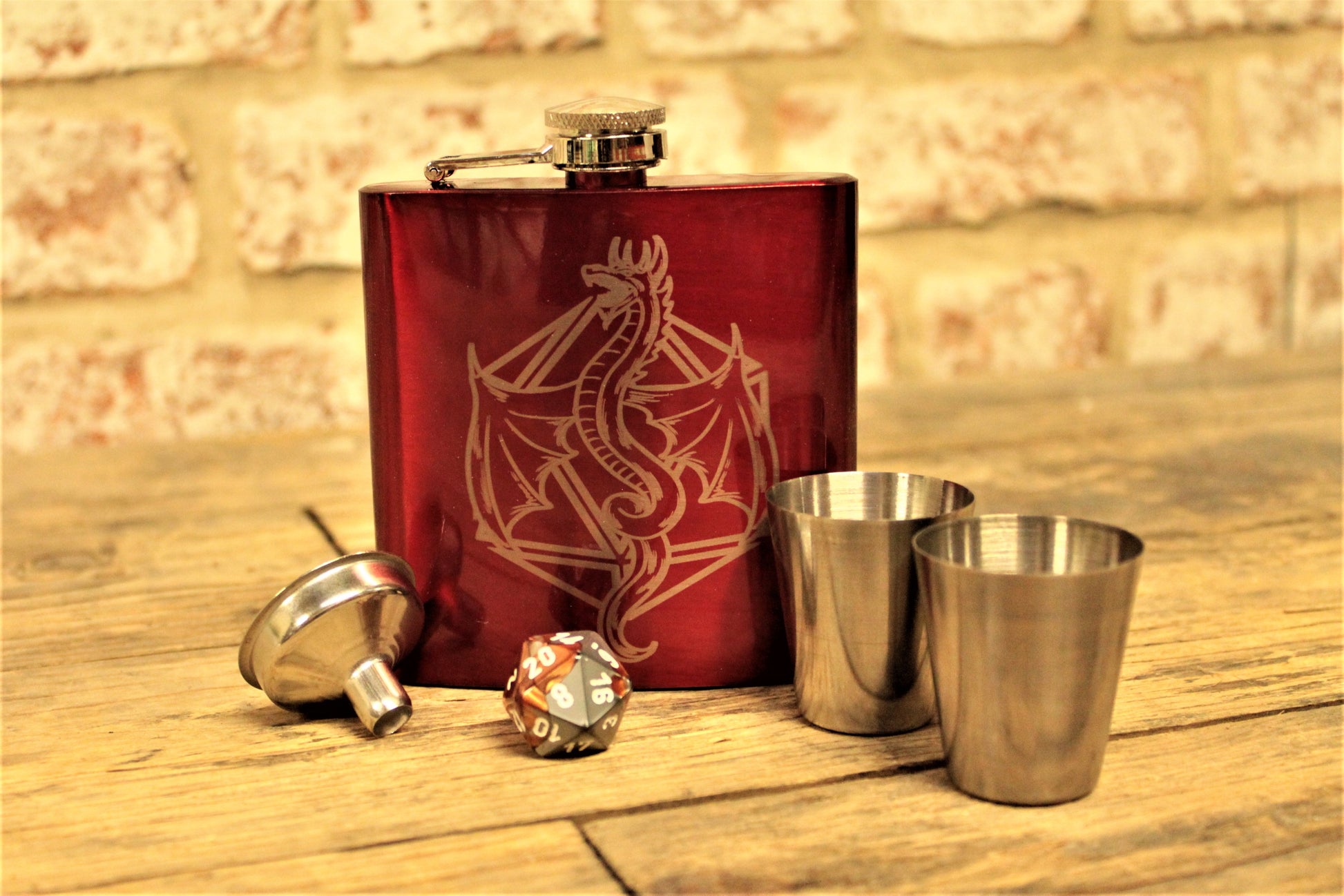 D20 Dragon design stainless steel engraved hip flask with choice of 4 colours.