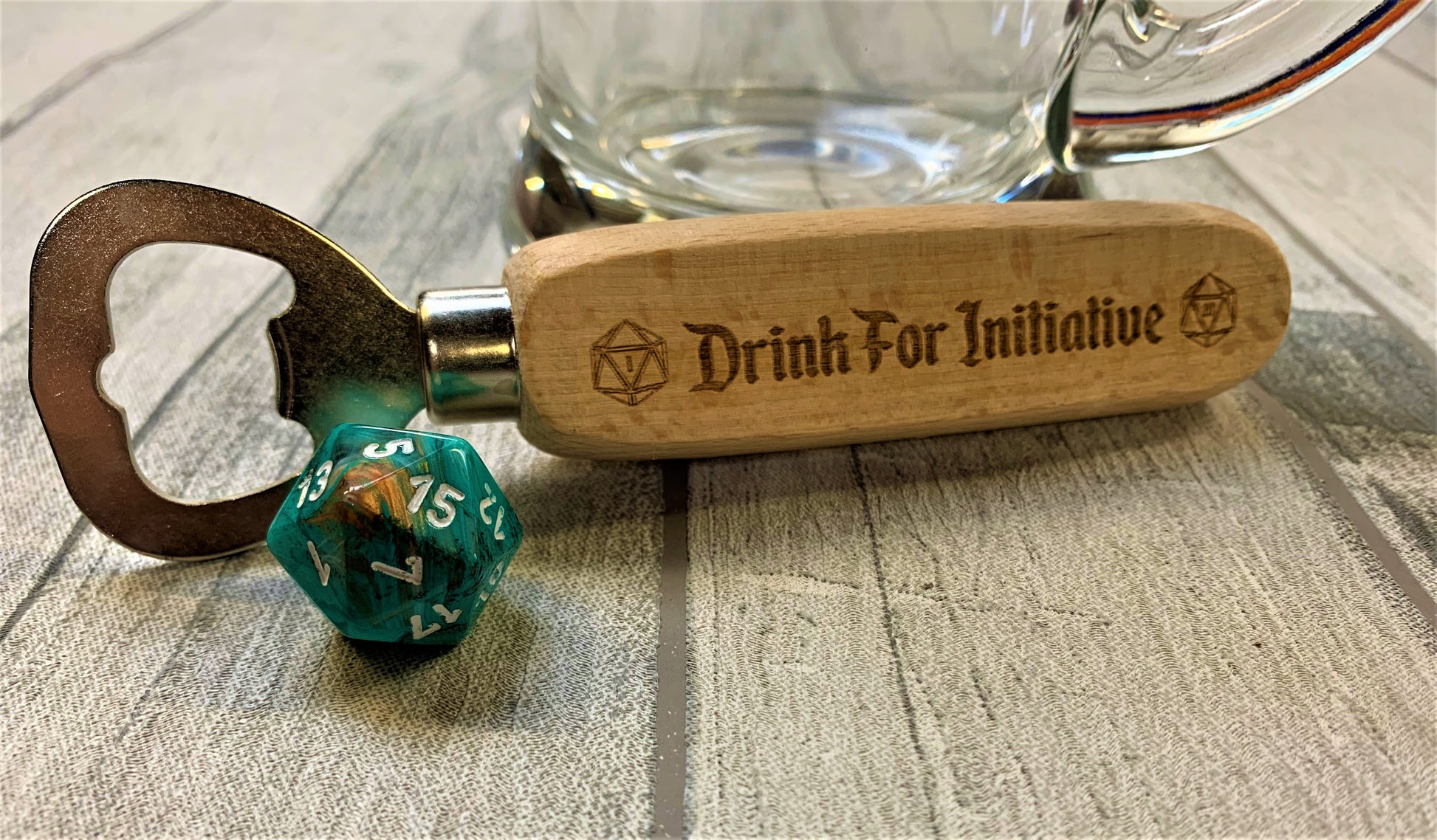 Engraved wooden handles bottle opener with "Drink For Initiative" design. A perfect gift for any RPG or DND fan. Made from solid beech, stainless steel opener and engraved to order; these make a perfect quirky drinking gift.