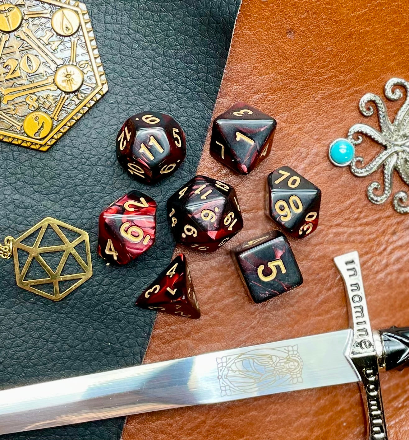 Harness the power of the fire elemental spirits with these fantastic resin dice. Combining dark red and black swirls, each dice has its own unique pattern.