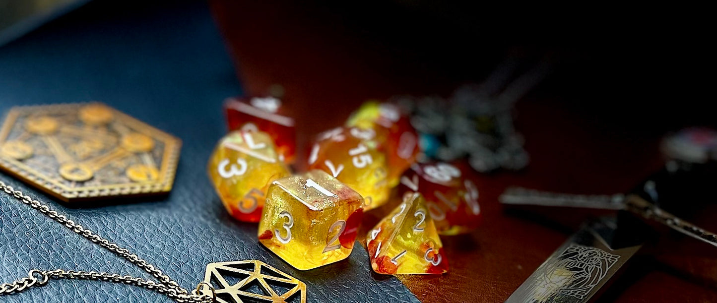 Awaken the elements with these fantastic resin dice. Combining red and yellow translucent resin; each dice has its own unique pattern.