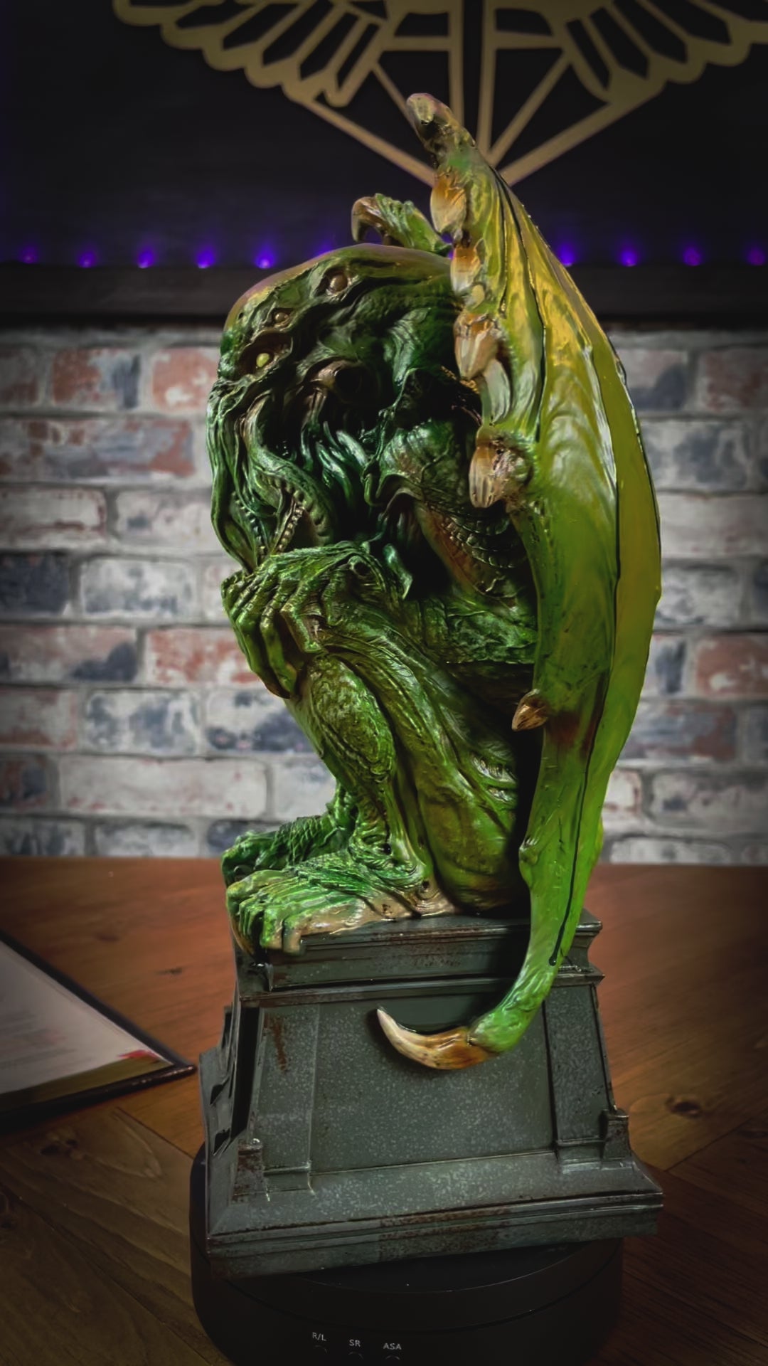 Created by internationally renowned Gothic and Fantasy artist James Ryman, this monstrous figurine holds the spirit of Cthulhu. He is said to resemble a human octopus and stands hundreds of metres tall. With webbed human-looking arms and legs and a pair of rudimentary wings on his back, it is no surprise that Lovecraftian's worship him. In this version, the mighty deity is emerald green in colour and sits atop a large monument, eyes piercing all those who gaze upon him. Cast in the finest resin before being lovingly hand-painted, this piece would make a fantastic gift for anyone who has an obsession with the classics of horror.