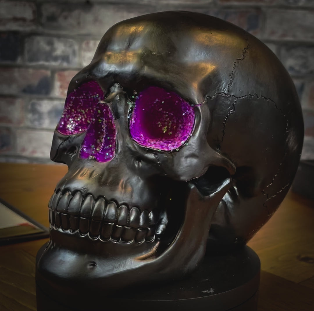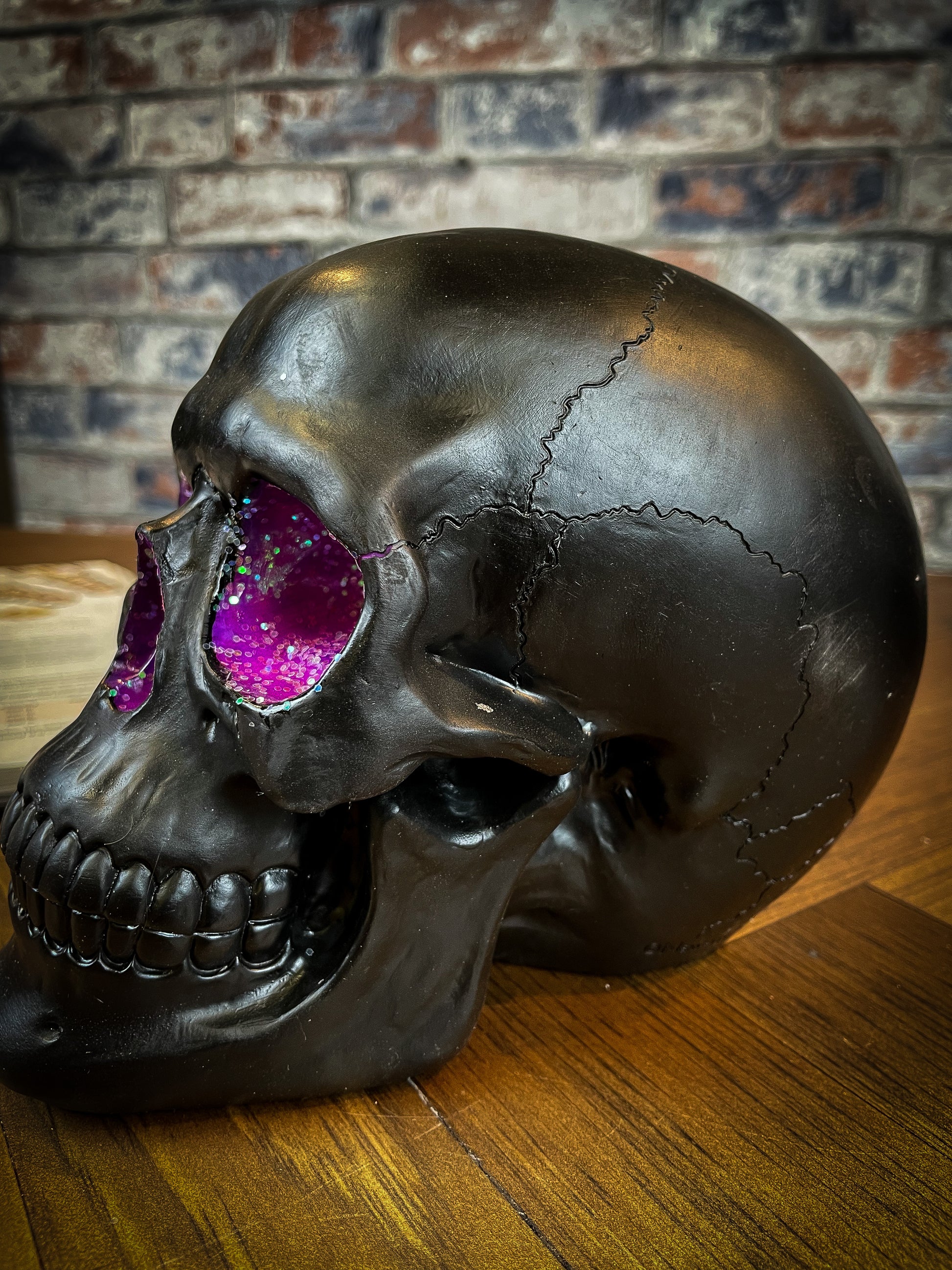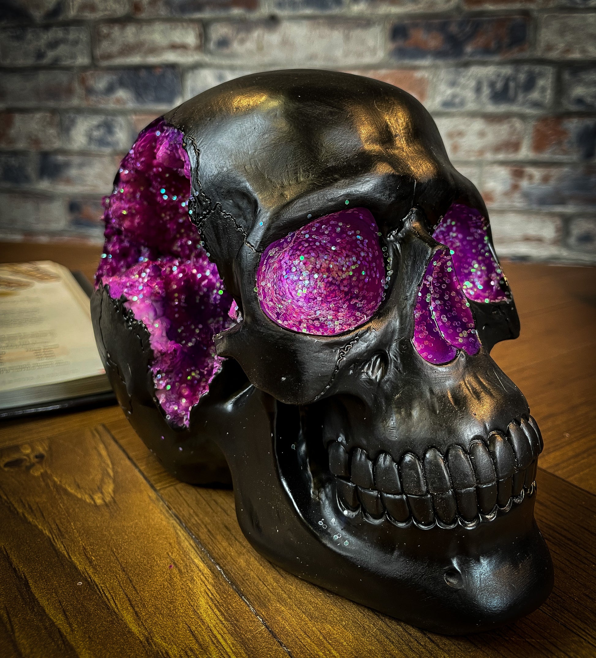 The most unassuming facade can hide the most scintillating interior. This matte black skull has eyes and nose holes that open up to a sparkling purple world. A large crack at the side of the skull reveals an enchanting purple crystal geode within, sparkling in the light. Cast in high-quality resin before being lovingly hand-painted, this skull makes a magical addition to any shelf.