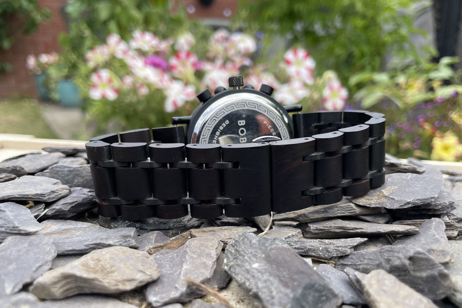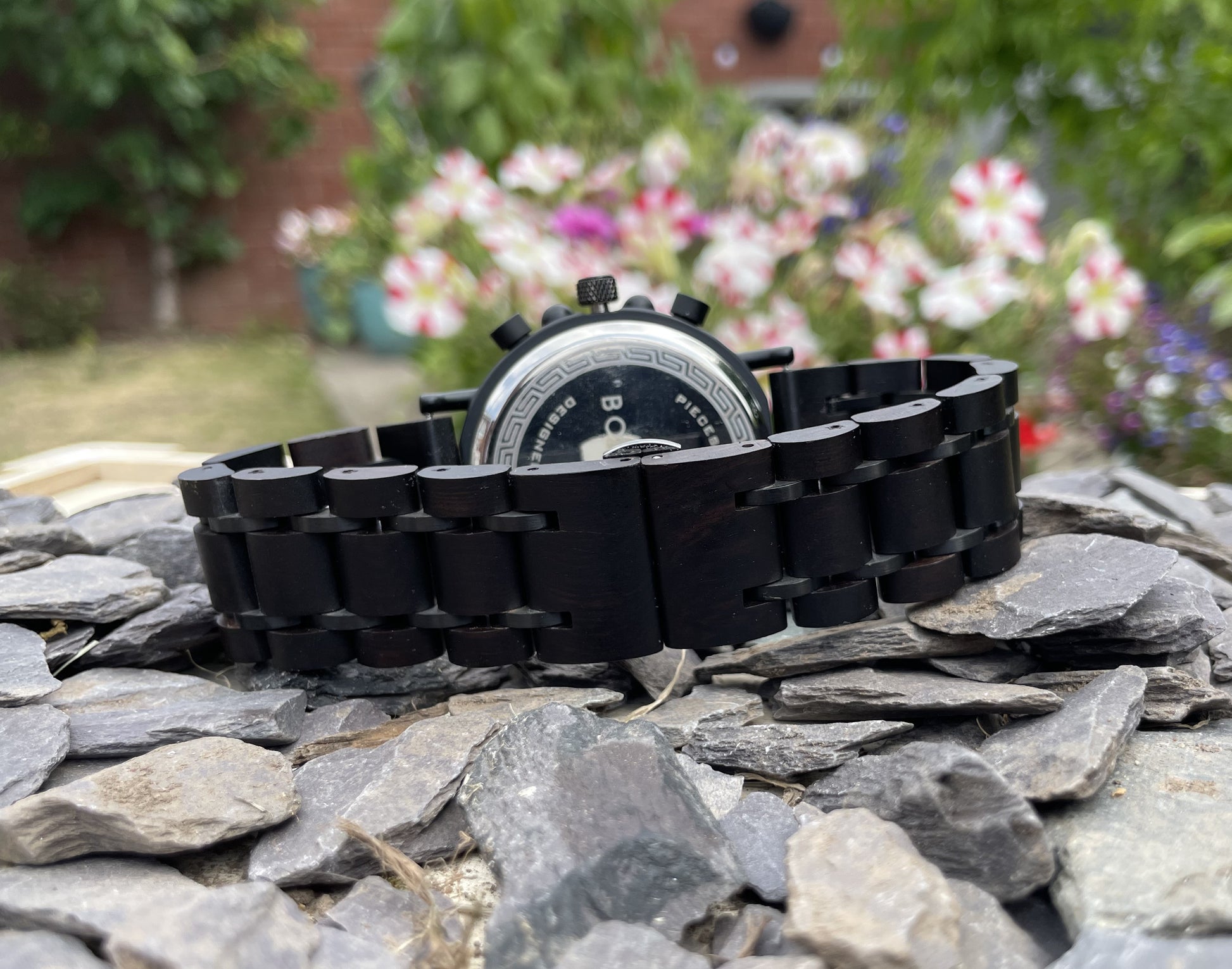 Made from solid wood and black anodised stainless steel; these watches are both comfortable to wear and a unique timepiece. Featuring a black wood strap with black metal links; this watch makes a unique and stylish watch. This watch also comes with decorative stencil style numbers on the face, giving a highly distinctive look.