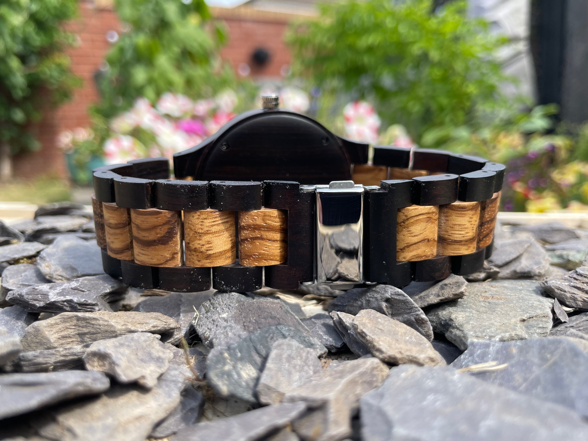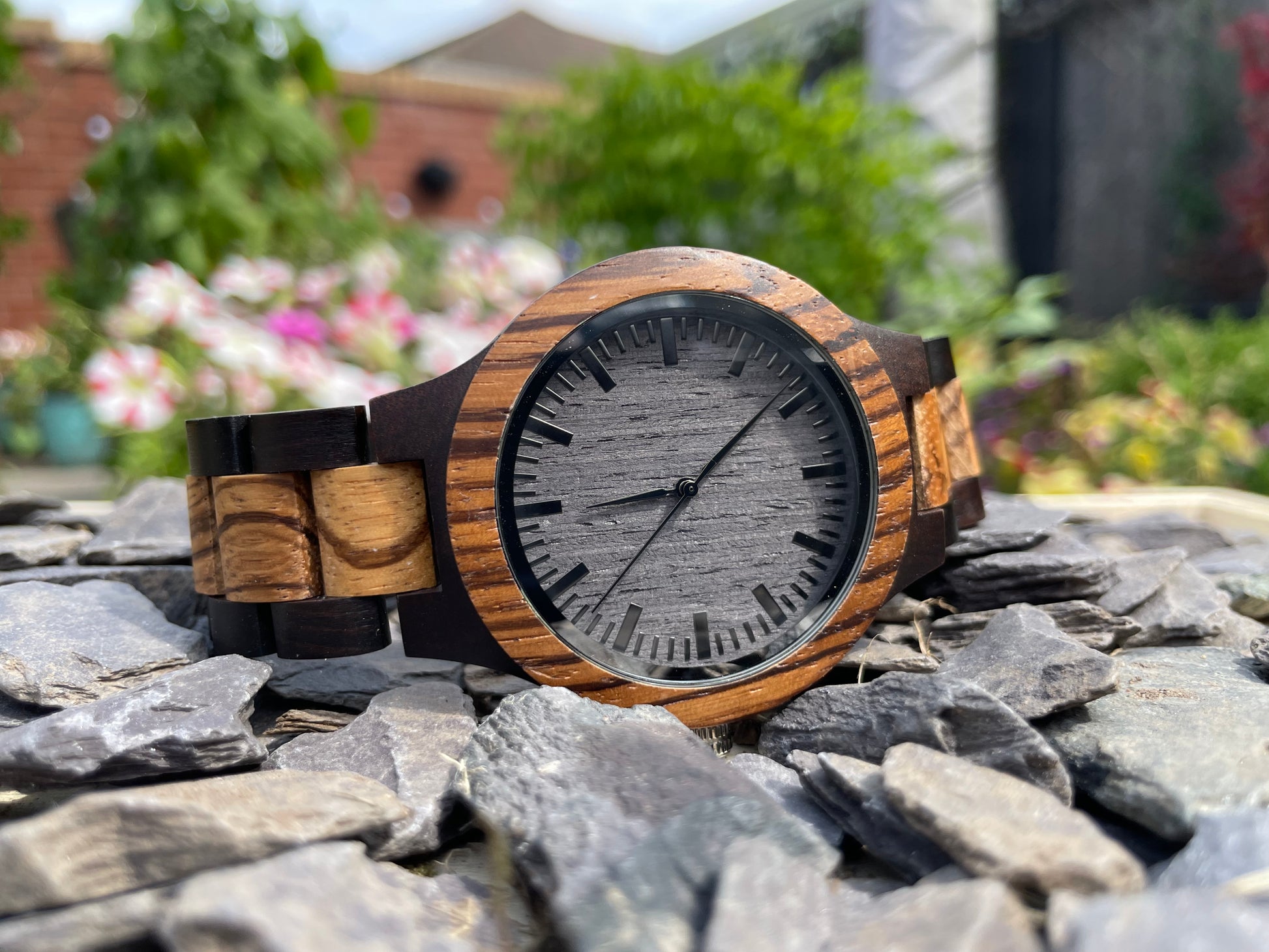 Made from solid walnut and Zebrano; these watches are both comfortable to wear and a unique timepiece. Featuring a walnut and "Zebra Wood" interlocking strap; this watch makes a unique and stylish watch. This watch also comes with a grey woodgrain effect face giving a highly detailed look.