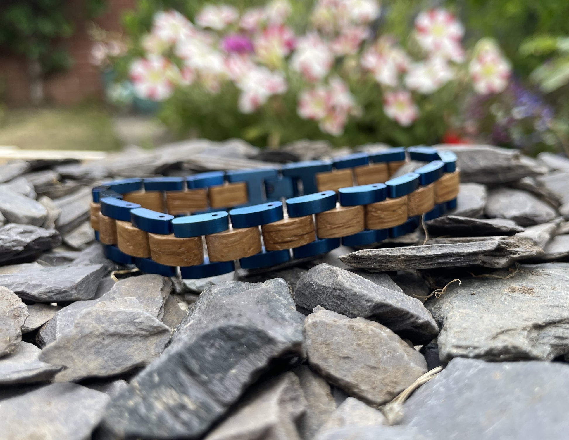 Made from solid "Zebra Wood" Zebrano and blue anodised stainless steel; these bracelets are both comfortable to wear and a unique piece of jewellery. Featuring highly polished zebrano and blue stainless steel, they are a great accompaniment to any outfit